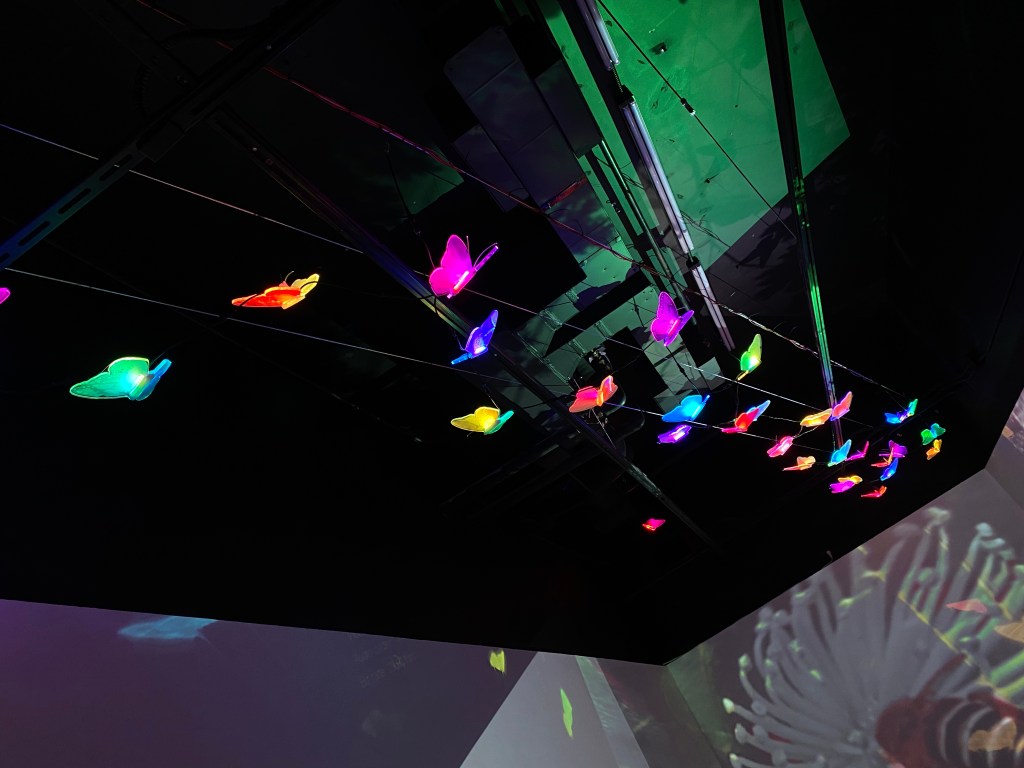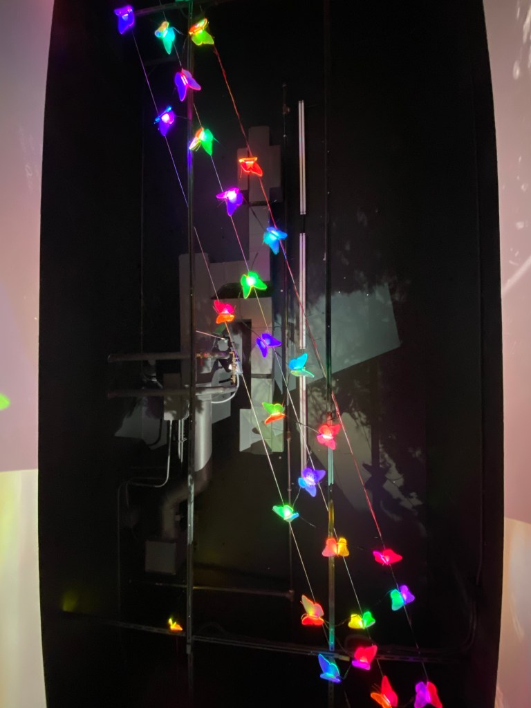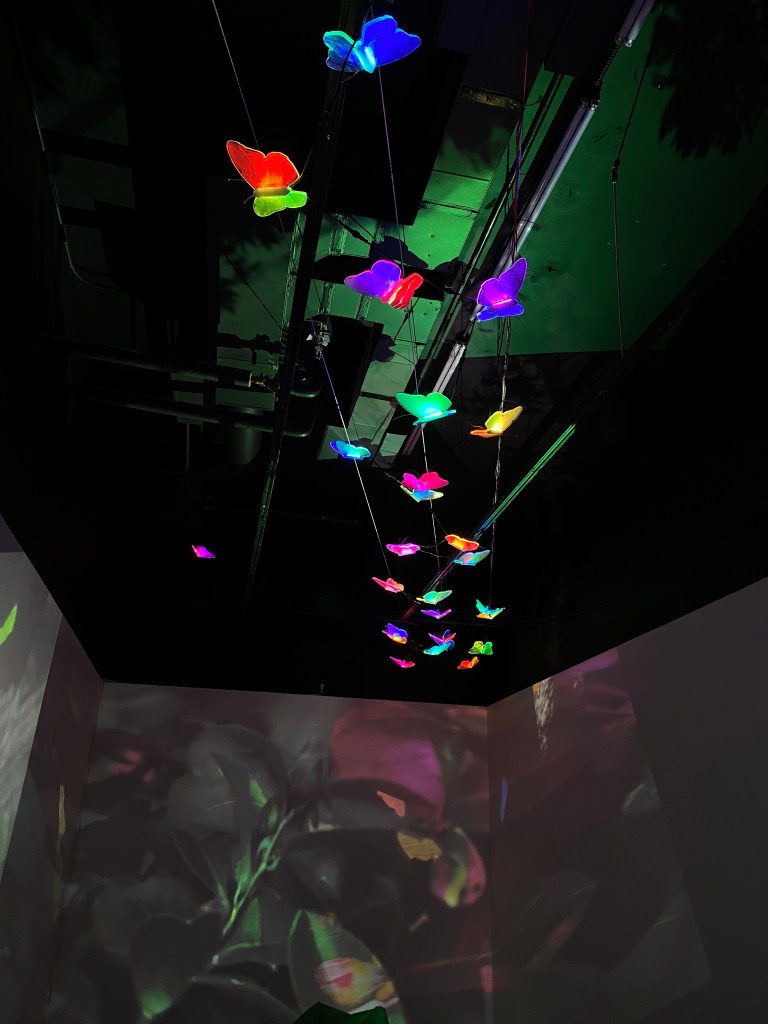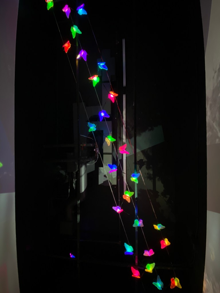 The title, Butterflying, connotes the ongoing transition from a single static noun into multiple moving verbs by using “ing.” The process of bridging the different entropies takes enlightened time and space. Floating in this capsulized luminous space and time, Butterflying (2023), visitors experience a reification, self-effacement time to be immersed with forms and colors with lights.
