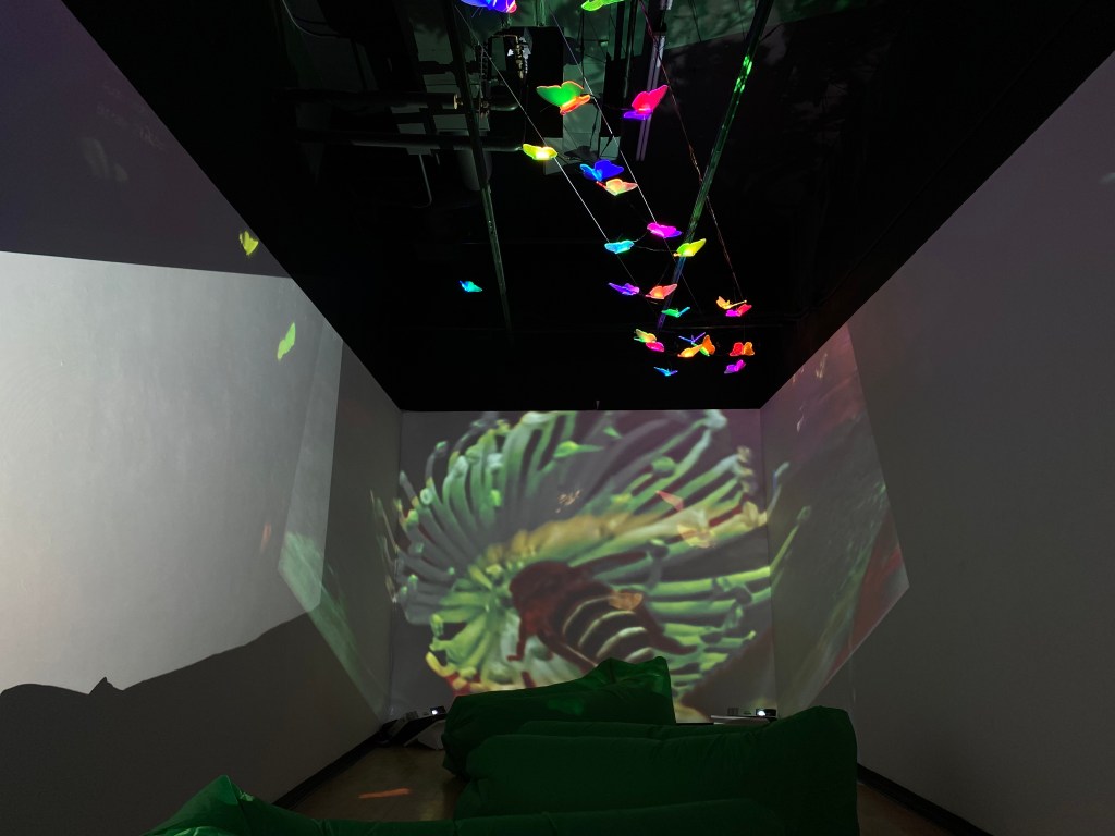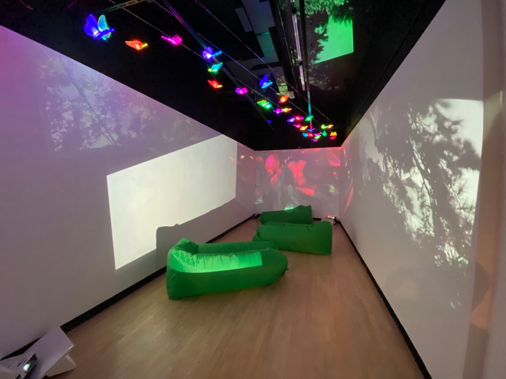 Butterflying (2023) is a collaborative installation using sculptural forms and video projections. 33 laser cut butterflies sculptures and 6 projectors envision a dreamlike “butterflying” experience for visitors. Three green inflatable couches create a space that invites viewers to be still, to sit and engage with moving within timespace. The vibrantly lighted butterflies are suspended from above the gallery walls and the seating is set back, allowing the white wall space to be fully available for the video sequences. The lines on which butterflies are installed simulate the tracking path of the electricity movement, the source of light. All videos were recorded on islands in South Korea in winter. Going back and forth to the island, we must cross between lands. This mimics the movement of the “noun-verb” transition process. The place of islands makes the pace of walking slow down, dream, and butterfly. Winter, the cold season is the migrating time for most butterflies. Some species do not spend the winter as adults due to their short lifespan. Moreover, Scientists also found that butterflies raised in captivity do not migrate. Searching for hugging lights, colorful waves of leaves, and cozy smells of breeze is only allowed for the willing.